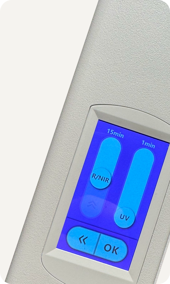 UV light requires respect, not fear. Aurora's dual-timer lets you dial in precise session lengths so you never overexpose. Start at slow and build gradually. The included eyewear protects you during every UV session.